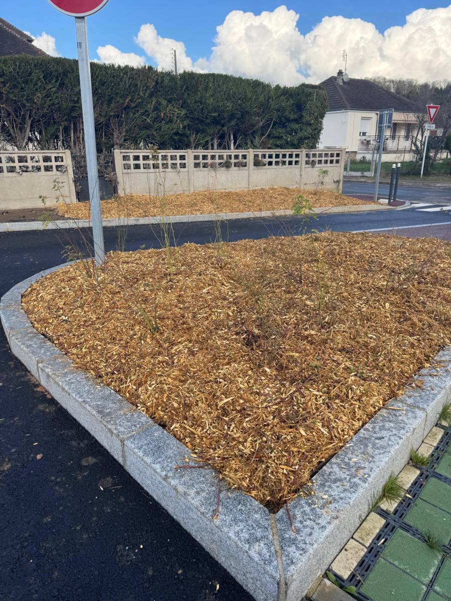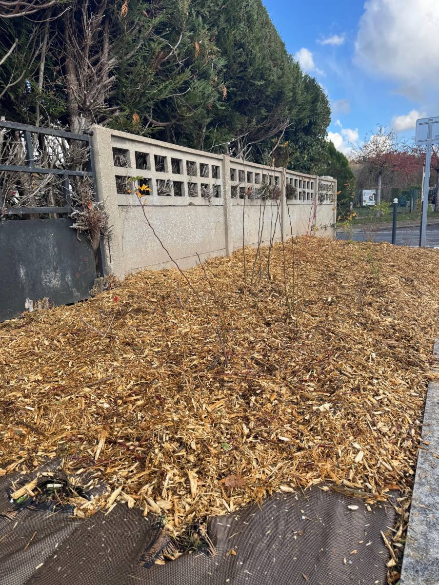 Nous avons effectués l'engazonnement, la plantation avec bache et le paillage du nouveau parking à Beaumont le Roger.